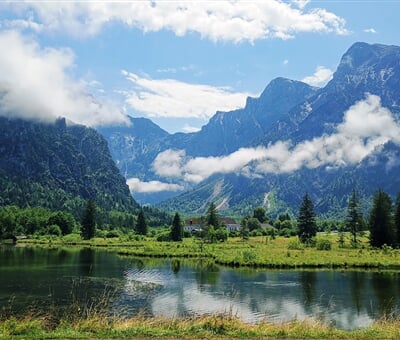Hinterstoderu podél průzračné divoké říčky k nedalekému úchvatně romantickému jezeru, nad jehož modrozelenou hladinou se tyčí majestátní vrchol GR. PRIEL.